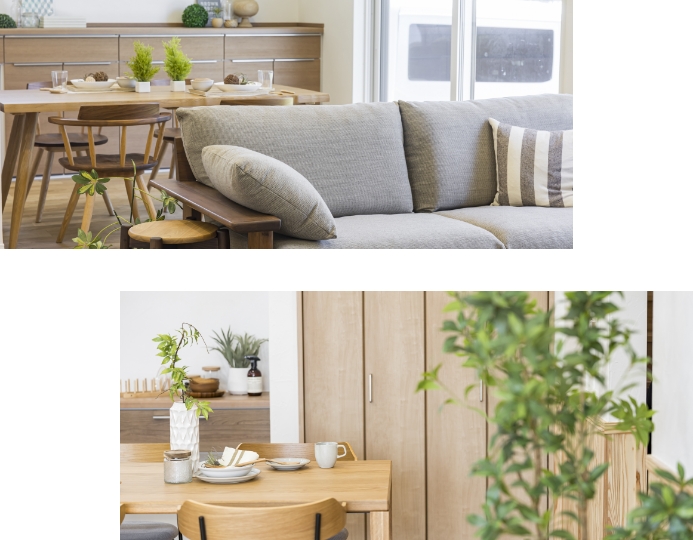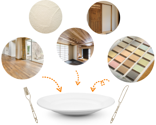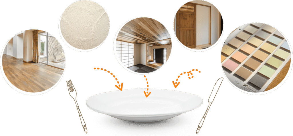 床や壁に使用する素材は、全棟 自然素材が標準仕様。ほっとスマイルハウスが厳選した80種以上の自然素材から、お客様が費用を気にせず内装を自由に選べます。「ビュッフェスタイル」ですから、何を選んでも追加料金はありません。